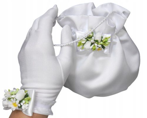 Komplet komunijny: Rękawiczki gładkie bez zdobień,  bransoletka na ozdobnej gumce na jedną rączkę oraz  torebka satynowa w kształcie woreczka z wkładką pomagającą w zachowaniu kształtu woreczka nawet po obciążeniu. Ozdobiona stroikiem z uroczymi stokrotkami. Woreczek został uszyty z pierwszego gatunku satyny ślubnej. Na pozostałych aukcjach można dopasować np.  profitkę na świecę komunijną lub rękawiczki zakładane na jeden paluszek oraz wianek.