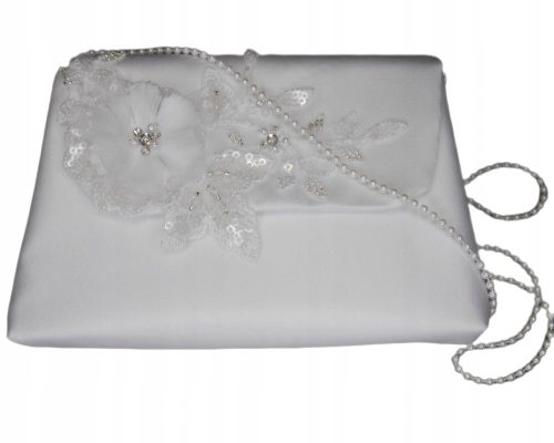 Torebka komunijna, prostokątna z długi  perełkowym sznureczkiem wykonana z satyny ślubnej wysokogatunkowej. Ozdobiona  koronkowym kwiatkiem 3D. bogato zdobionym perełkami, cekinami i koralikami. Torebka posiada wkładkę pomagającą zachować kształt nawet po obciążeniu. Na pozostałych aukcjach można do niej dobrać np. okapnik na świecę, rękawiczki lub opaskę  ozdobione taką samą aplikacją.