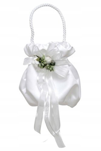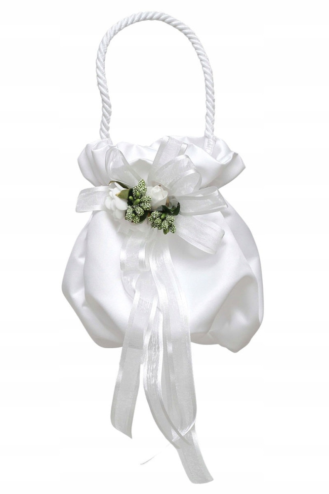 Elegancka torebeczka wykonana z grubej śnieżnobiałej półmatowej satyny ślubnej. Zdobiona kwiatuszkami wyglądającymi jak żywe w kolorze bieli i zieleni. Ściągana na gumeczce. Posiada wszyte okrągłe dno przez co nie jest płaska. Do trzymania w ręce. Wysokość ok 20cm plus sznureczek o długości ok25cm