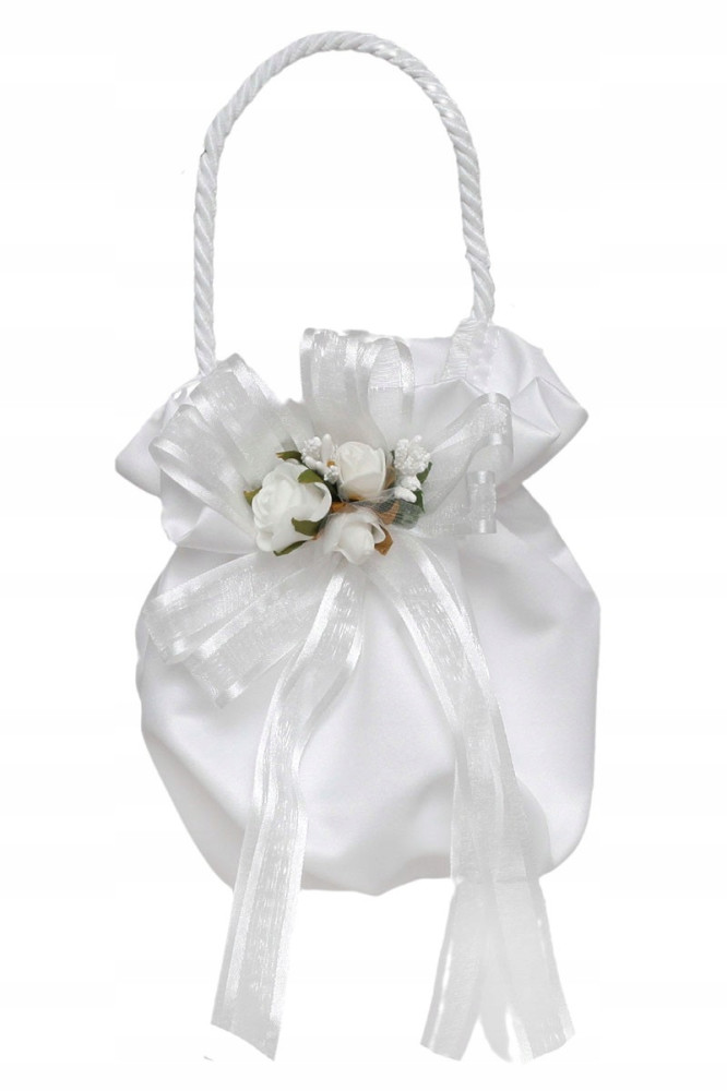 Elegancka torebeczka wykonana z grubej śnieżnobiałej półmatowej satyny ślubnej. Zdobiona kwiatuszkami wyglądającymi jak żywe w kolorze bieli i zieleni. Ściągana na gumeczce. Posiada wszyte okrągłe dno przez co nie jest płaska. Do trzymania w ręce. Wysokość ok 20cm plus sznureczek o długości ok25cm