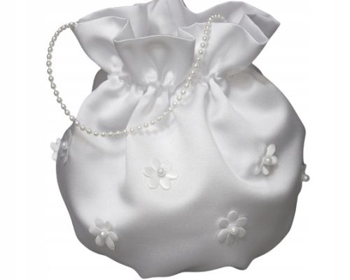 Torebka komunijna w kształcie woreczka z ręcznie naszywanymi perełkami. Wykonana z satyny bardzo dobrego gatunku z usztywnianą wkładką, pomagającą w zachowaniu kształtu woreczka nawet po obciążeniu. Na pozostałych aukcjach można produkt ten kupić w zestawieniu z rękawiczkami i okapnikiem.