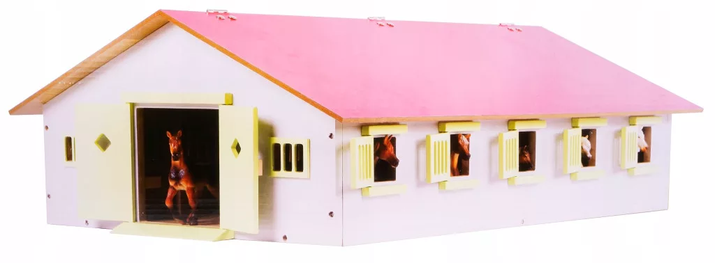 Duża drewniana stajnia wykonana została całkowicie z drewna i materiałów drewnopodobnych w skali 1:32. We wnętrzu posiada aż dziewięć boksów dla koni oraz pomieszczenie gospodarcze.