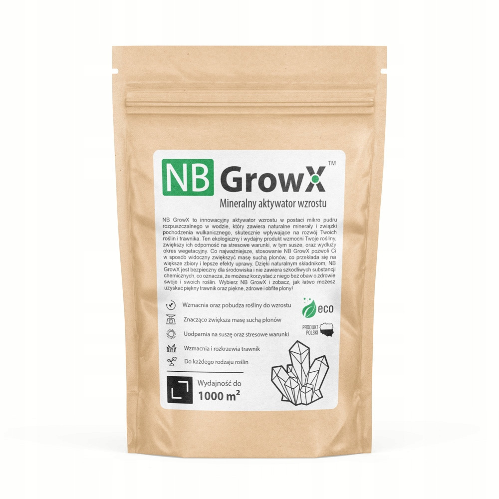 NB GrowX to innowacyjny aktywator wzrostu w postaci mikro pudru rozpuszczalnego w wodzie, który zawiera naturalne minerały i związki pochodzenia wulkanicznego, skutecznie wpływające na rozwój Twoich roślin i trawnika. Ten ekologiczny i wydajny produkt wzmocni Twoje rośliny, zwiększy ich odporność na stresowe warunki, w tym susze, oraz wydłuży okres wegetacyjny. Co najważniejsze, stosowanie NB GrowX pozwoli Ci