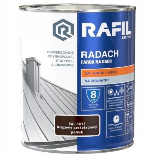 RAFIL RADACH FARBA NA DACH Profesjonalna farba do malowania dachów, rynien i parapetów. Produkt 2 w 1: grunt + farba. Zapewnia podwyższoną ochronę przed działaniem zmiennych warunków atmosferycznych i promieniowaniem UV. Tworzy trwałą, wysoce elastyczną powłokę. Może być stosowana do zewnętrznych powierzchni stalowych, ocynkowanych i aluminiowych, zarówno przy wykonywaniu nowych wymalowań, jak i renowacji starych powłok malarskich. Farba zapewnia wysoką wydajność: do 12m2/l przy jednokrotnym malowaniu i 8 lat gwarancji ochrony.