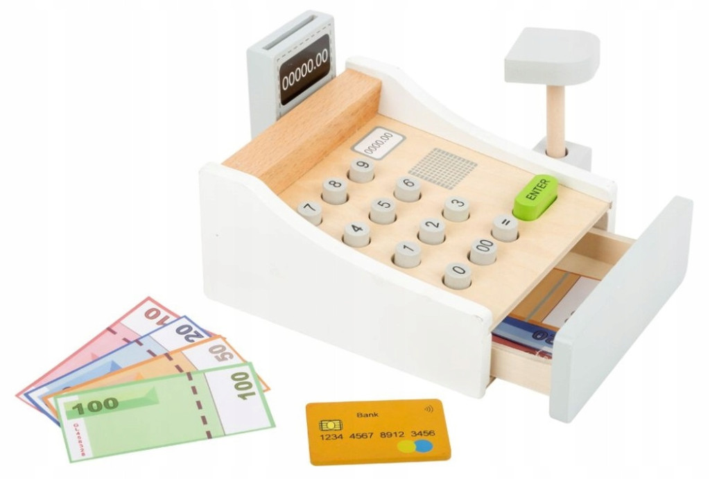 Drewnianej kasy nie da się porównać z kasami plastikowymi, które zdominowały rynek zabawek dziecięcych. Drewniana kasa jest zdecydowanie bardziej trwała i cichsza, co będzie niewątpliwą zaletą dla rodziców. Kasa nie wydaje żadnych dźwięków.
