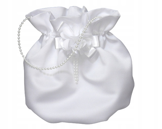 Torebka komunijna w kształcie woreczka uszyta z satyny pierwszego gatunku i ozdobiona satynową tasiemką premium oraz satynowym kwiatkiem 3D.