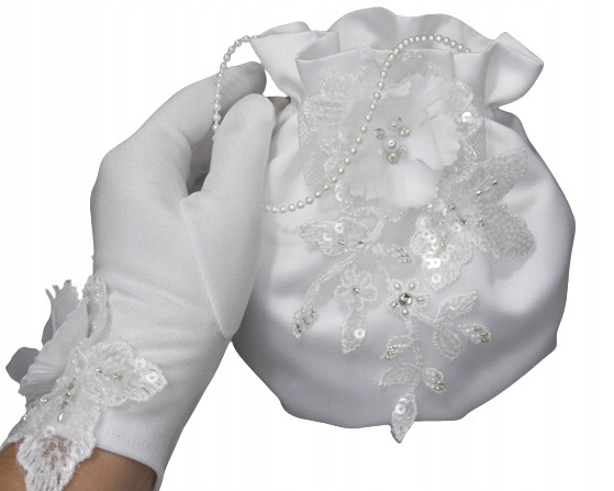 Komplet do komunii w składzie: Rękawiczki i torebka komunijna wykonana z satyny ślubnej pierwszego gatunku. Ozdobiona koronkową aplikacją 3D bogato zdobioną perełkami kryształkami i koralikami. Torebka posiada sztywną wkładkę która pomaga zachować jej kształt nawet po obciążeniu. Na pozostałych aukcjach można kupić każdy element zestawu osobno lub w komplecie z rękawiczkami zakładanymi na jeden paluszek.