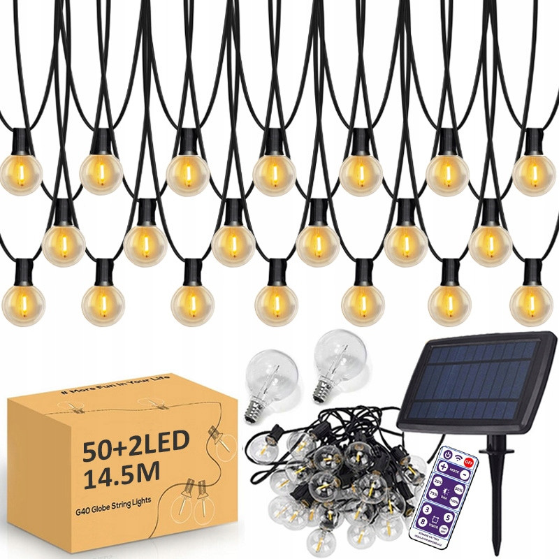 Solarna lampa łańcuchowa zewnętrzna G40 ma 14,5M długości, 50 sztuk żarówek kulowych.Światła zasilane są energią słoneczną.Żarówki LED o wysokiej wydajności oszczędzają ponad 90% energii w porównaniu z żarówkami.Słoneczne zewnętrzne oświetlenie łańcuchowe automatycznie włącza się w nocy i wyłącza w ciągu dnia.Ładowanie USB może być uzupełnieniem, gdy w ciągu dnia nie ma wystarczającej ilości światła słonecznego.