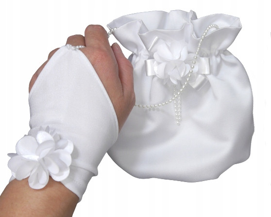 Komplet komunijny, rękawiczki białe zakładane na jeden paluszek i  torebka satynowa w kształcie woreczka z wkładką pomagającą w zachowaniu kształtu woreczka nawet po obciążeniu. Ozdobiona ślicznym satynowym kwiatem 3D. Woreczek został uszyty z pierwszego gatunku satyny ślubnej. Na pozostałych aukcjach do kompletu można dopasować np.  profitkę na świecę komunijną.