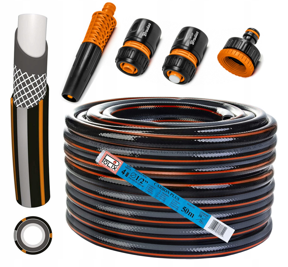 WĄŻ OGRODOWY 1/2" 50m 4 WARSTWY POLIX + ZRASZACZ i ZŁĄCZKI BRADAS