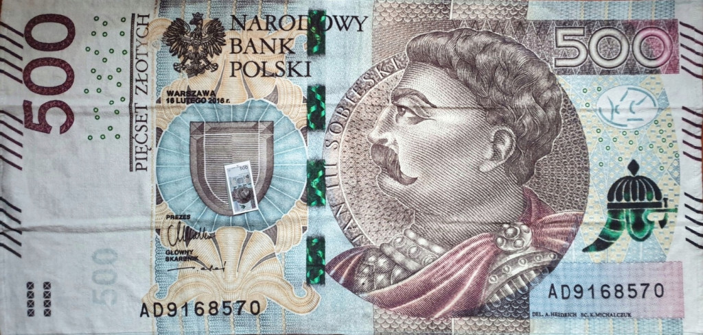• odwzorowany banknot 500 zł, dzięki czemu ręcznik wygląda jak duży banknot