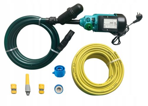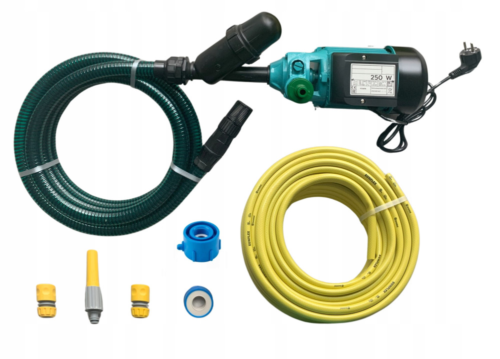 Najbardziej niezawodny i niezniszczalny model ogrodowej pompy wysokiego ciśnienia w zestawie z wężem ssawnym oraz wężem do podlewania ogrodu.