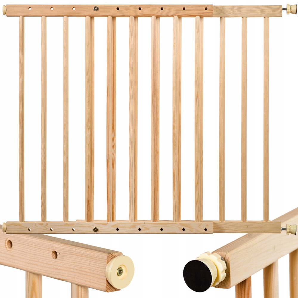 • SPECYFIKACJA – materiał: drewno – sosna; bramka pasuje do przejść o szerokości: 66-117 cm; wysokość bramki: 68 cm;  grubość szczebelka: 15,5 mm; waga bramki: 2,4 kg; waga z opakowaniem: 3,1 kg.