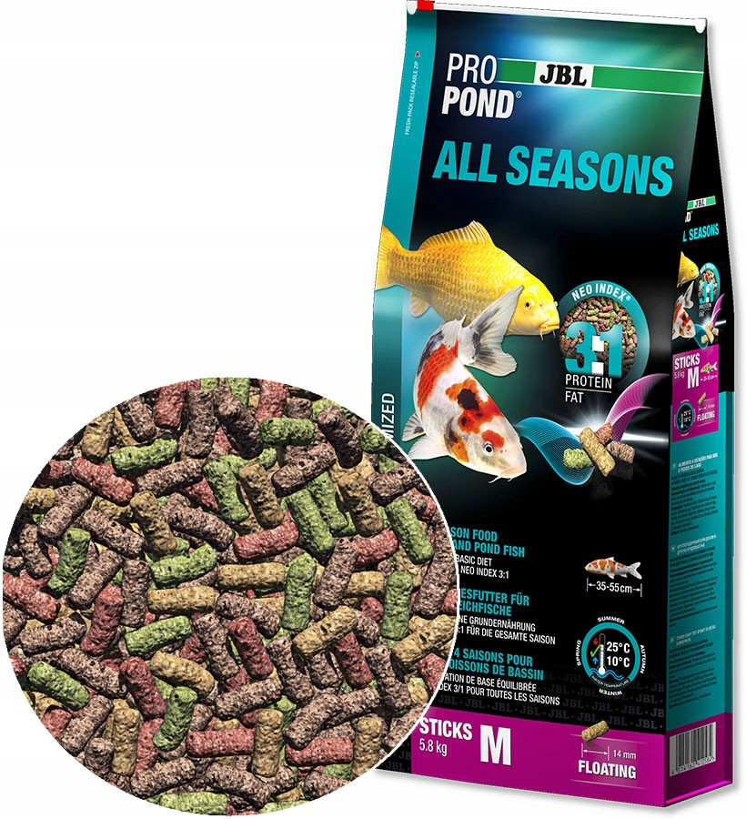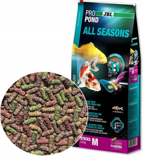 ProPond All Seasons M to pokarm w postaci pływających pałeczek dla ryb stawowych o długości od 35cm do 55cm. Skład pokarmu został specjalnie opracowany tak aby proporcja białek do tłuszczy była właściwa i zgodna z NEO Index, otrzymując optymalny pokarm odpowiedni na każdą porę roku, temperaturę wody (10-25 °C), wielkość i wiek ryb. Karma zawiera niezbędne składniki odżywcze, witaminy oraz pierwiastki śladowe. Zapewnia prawidłowy rozwój, wzmacnia odporność i zdrowie ryb. Naturalne substancje zawarte w pokarmie podkreślają ich ubarwienie. Pałeczki są łatwo przyswajalne dla ryb, dzięki czemu jakość wody i jej przejrzystość będzie lepsza niż w przypadku innych pokarmów.