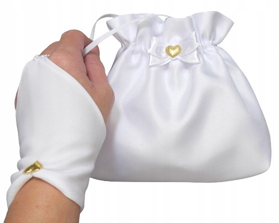 Komplet komunijny. Torebka i rękawiczki zakładane na jeden paluszek, idealne do alby ozdobionej złoty akcentem. Torebka wykonana została z satyny atłasowej odszytej na matową stronę i ozdobiona złotym satynowym serduszkiem. Na pozostałych aukcjach można kupić każdy produkt osobno lub w komplecie z okapnikiem i rękawiczkami pięciopalczastymi