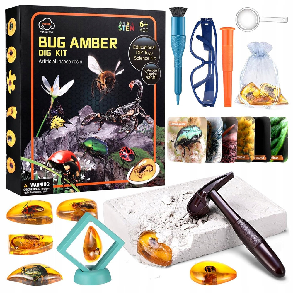 W gipsowym odlewie zostało ukrytych sześć bursztynów z zatopionymi owadami. Naszym zadaniem jest wykopanie ich za pomocą dołączonych przyrządów- młoteczka i dłuta. Jest to mozolna, ale bardzo satysfakcjonująca praca. Odnalezione bursztyny można umieścić w ozdobnym woreczku lub stojaku do prezentacji, dzięki czemu będą intersującą ozdobą każdego dziecięcego pokoju.