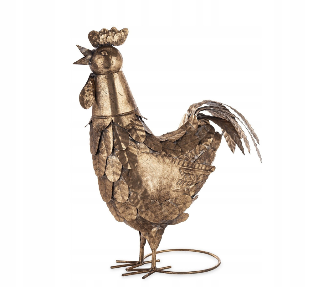 Ta imponująca metalowa figurka koguta to wyjątkowy element dekoracyjny, który doda charakteru i uroku każdemu wnętrzu. Wykonana z solidnego metalu o złotym, patynowanym wykończeniu, ta figurka emanuje wyrafinowanym stylem i starannie wykonanymi detalami.