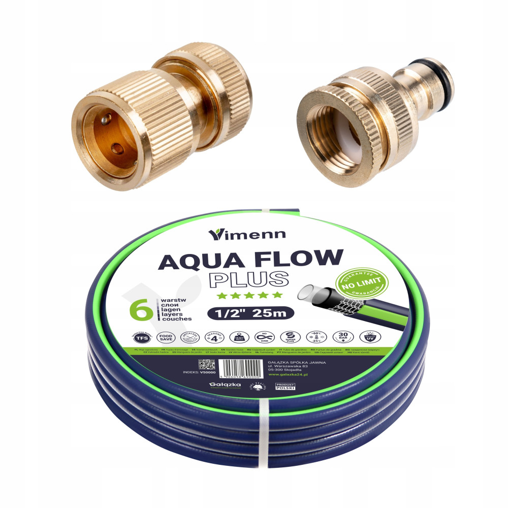 VIMENN KOMPLET WĄŻ OGROD. 6 WARSTW 1/2" 25m AQUA FLOW + 2 ZŁĄCZKI RICHMANN