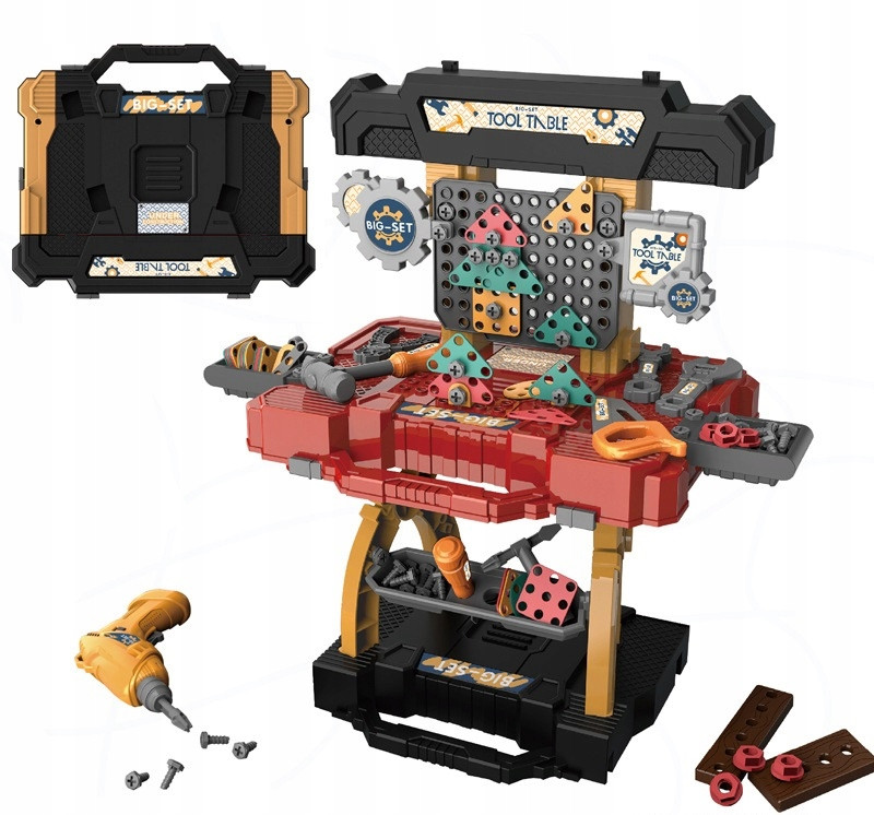 98-częściowy zestaw narzędziowy, przekształcający się w stół warsztatowy to doskonała zabawka do rozwijania kreatywności, zdolności manualnych i wyobraźni dziecka.