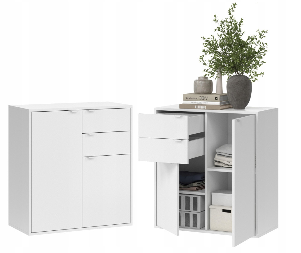 Komoda 2D 2SZ wyposażona w 2 drzwi i 2 szuflady jest niezwykle praktyczna.