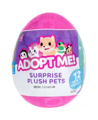 Odkryj niezwykle pożądane zwierzaki z Adopt Me!, popularnej gry online z asortymentem pluszowych zwierzątek z jajkiem niespodzianką.  Rozpakuj jajko i odkryj pluszowego zwierzaka Surprise o wielkości 12 cm.  Seria 3 oferuje różnorodne zwierzaki, w tym Royal Corgi, Różowy Kot, Kałamarnicę i inne, z szansą na znalezienie metalicznego Złotego Pingwina.