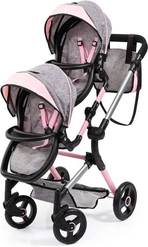 Ten nowoczesny wózek dla bliźniaków jest odpowiedni dla lalek o wzroście do 46 cm. Spacerówka posiada regulowane daszki przeciwsłoneczne oraz rączkę o regulowanej wysokości, którą można przesunąć tak, aby można ją było optymalnie dopasować do wzrostu dziecka. Siedziska spacerówki można mocować pojedynczo w kierunku dziecka lub w kierunku jazdy - tak, aby lalki mogły np. na siebie patrzeć. Możliwe jest również ustawienie siedzeń tak, aby były prosto wobec siebie, lub jedno siedzenie było niżej, a drugie wyżej. Wózek dla bliźniaków można również złożyć, aby zaoszczędzić miejsce. Dzięki zintegrowanemu koszykowi na zakupy wszystko, co jest potrzebne na wycieczkę z lalkami, można schować.