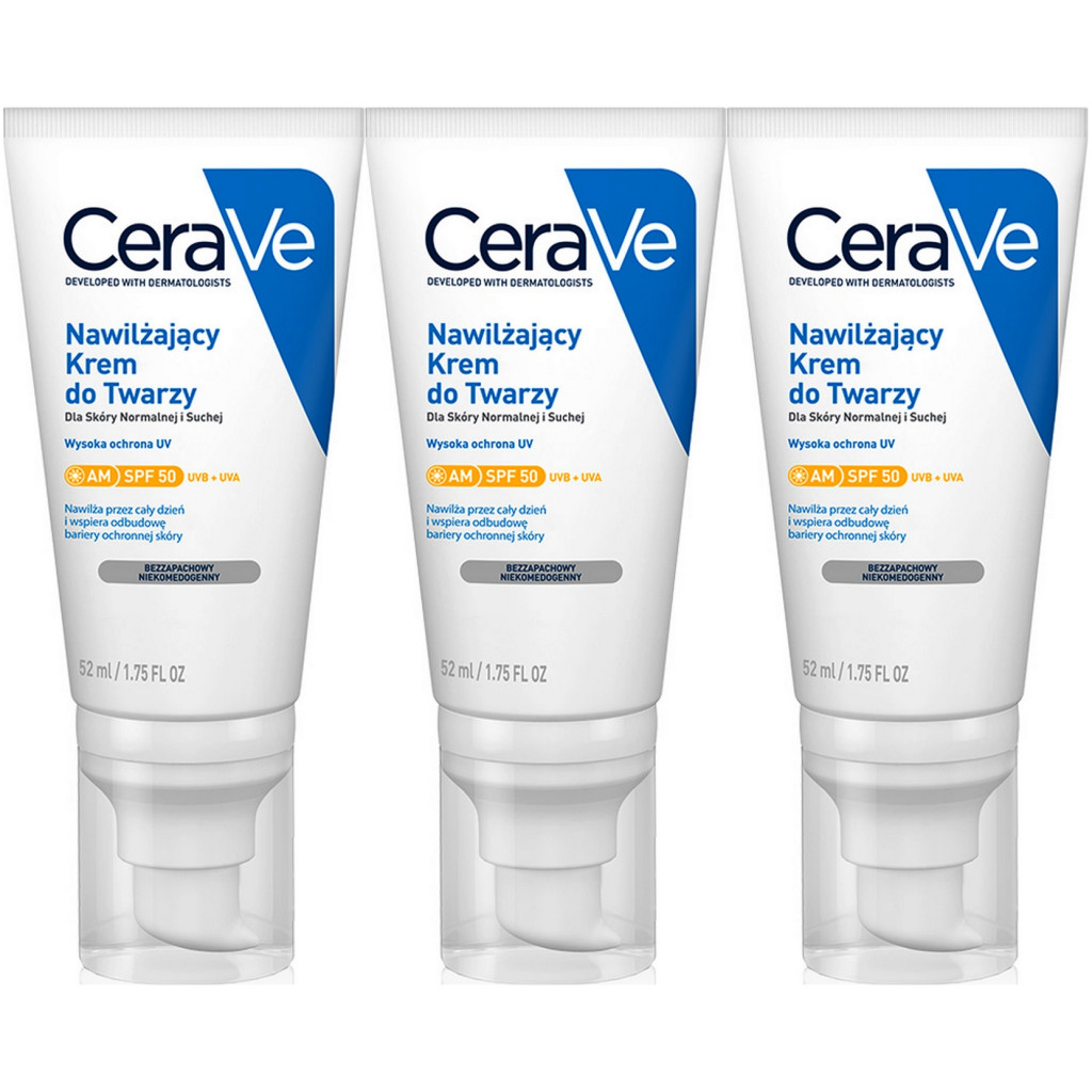 Krem nawilżający do twarzy CeraVe SPF 50 na dzień i noc 3 x 52ml. CeraVe Nawilżający Krem do Twarzy SPF 50, 52ml - Dla Skóry Normalnej i Suchej.