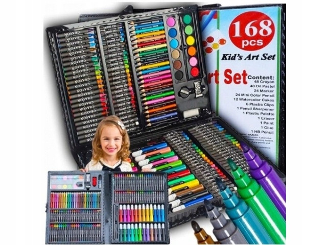 ZESTAW KREDEK PLASTYCZNY KREDKI MARKERY PASTELE FARBY KLEJ GUMKA TEMPERÓWKA 168 ELEMENTÓW