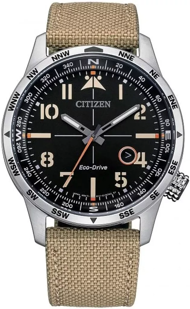 Ten zegarek Citizen Of Collection BM7550-10E, przeznaczony dla mężczyzn, ma stalową kopertę o okrągłym kształcie i srebrnym kolorze. Pasek wykonany jest z jasnobrązowego płótna, a ramka ma kardynalne punkty. Kolorowa czarna tarcza. Kryształ mineralny z zabiegiem antyrefleksyjnym, ruchem ekodrive (światło nieskończone) z rezerwą chodu 6 miesięcy. Kaliber E111 i wyświetlacz analogowy. Należy do kolekcji: Z kolekcji. Wodoodporność: 10 ATM. Średnica: 43 mm. Funkcje: 3 swiecące igła i kalendarz. Gwarancja z tyłu. Ciesz się zegarkiem Citizen.