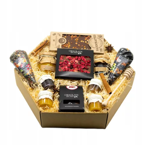 • Wygląd kosza: Kosz prezentowy w kształcie plastra miodu prezentuje się gustownie i stylowo.