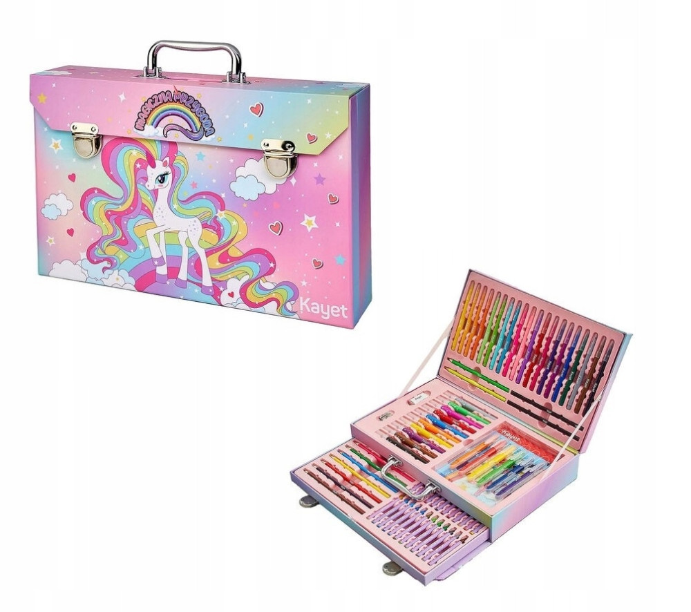 Zestaw artystyczny dla dzieci 77 elementów KAYET Kids jednorożec to nie tylko kreatywna zabawa, to podróż w świat wyobraźni! W eleganckiej walizce znajdziesz 12 kredków ołówkowych, 20 flamastrów, 6 wykręcanych kredek woskowych, 24 kredki woskowe, 10 pisaków akwarelowych, 2 ołówki HB, metalową temperówkę oraz gumkę do mazania. Książeczka do kolorowania z 25 arkuszami zachęca do tworzenia niezliczonych dzieł sztuki. Doskonały sposób na rozwijanie wyobraźni i umiejętności plastycznych u najmłodszych artystów już od 3 lat.