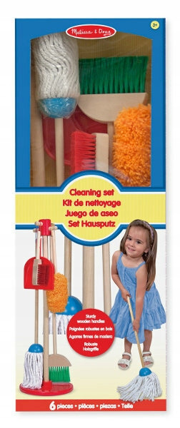 Zestaw do zabawy w sprzątanie. Zestaw składa sie z 6 elementów: miotły, mopa, ścierki do kurzu, szufelki, szczotki i stojaka. Wszystkie elementy sa wykonane solidnie i dostosowane do dziecięcego wzrostu. Pojemnij na kurz zatrzaskuje się na wszystkich uchwytach.