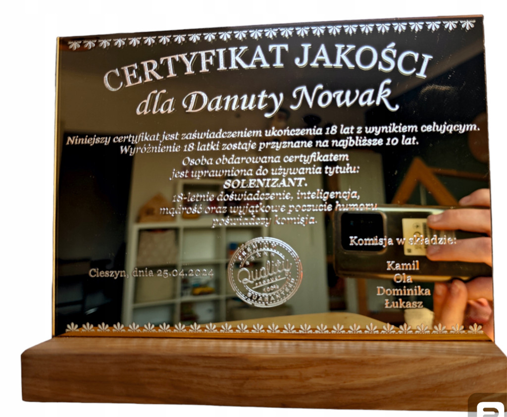 Certyfikat na urodziny personalizowane z dedykacją -  plexi złote lustro!