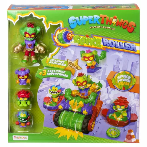 Paskudny Spike Roller z serii SuperThings Kazoom Kids jest tutaj ze swoim zespołem, Spike Power Team, aby siać spustoszenie w Kaboom City! Dzięki ogromnemu, ozdobionemu złotem pojazdowi jest gotowy zmiażdżyć wszystko, co stanie mu na drodze…. i nie jest sam w tej misji!