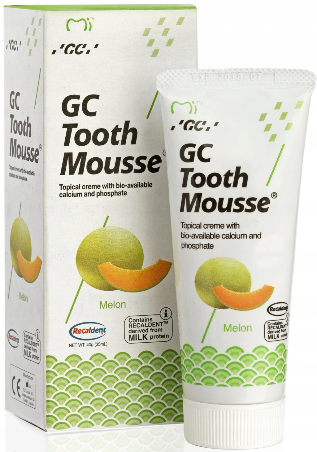 GC TOOTH MOUSSE 35ml – To specjalistyczny preparat do stosowania miejscowego, stanowi optymalny wybór dla kompleksowej profilaktyki przeciw próchnicy. Tooth Mousse dzięki swoim właściwościom przywraca prawidłową równowagę mineralną w jamie ustnej w zaledwie kilka minut od jego pierwszego zastosowania. Pasta przeciwdziała szkodliwym zmianom odczynu pH oraz dzięki wysokiemu poziomowi cząsteczek wapnia i fosforu – wzmacnia i odbudowuje szkliwo zębów. Produkt nie zawiera cukru
