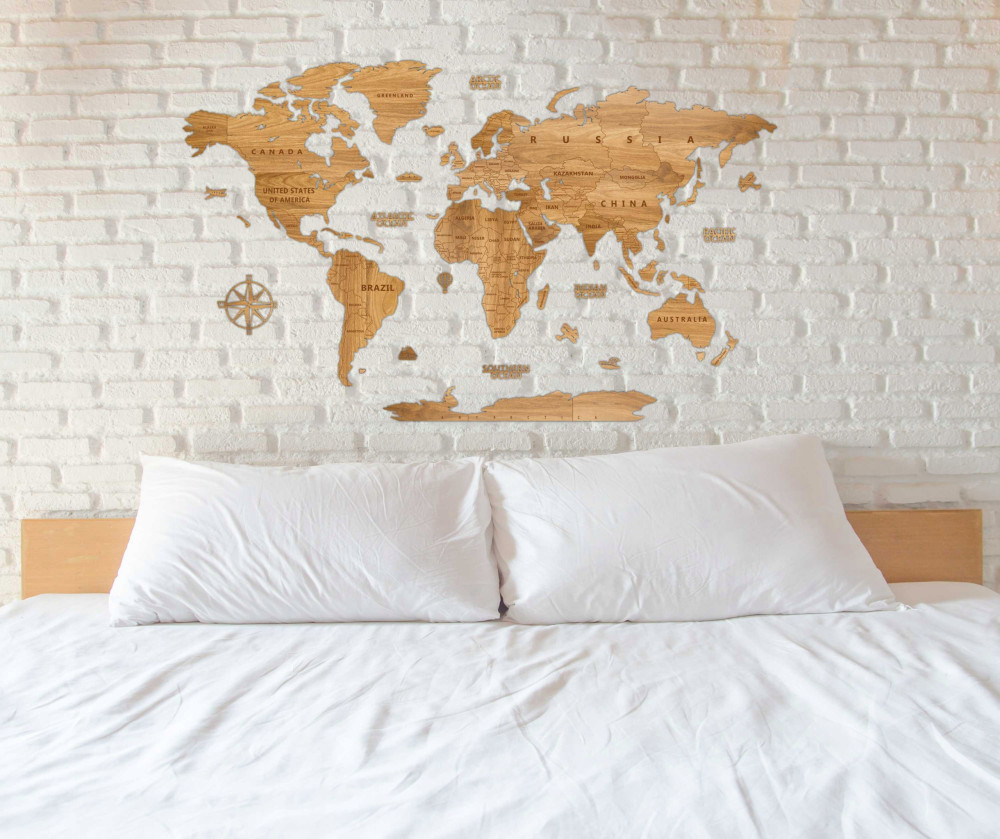 z drewnianą mapą świata.