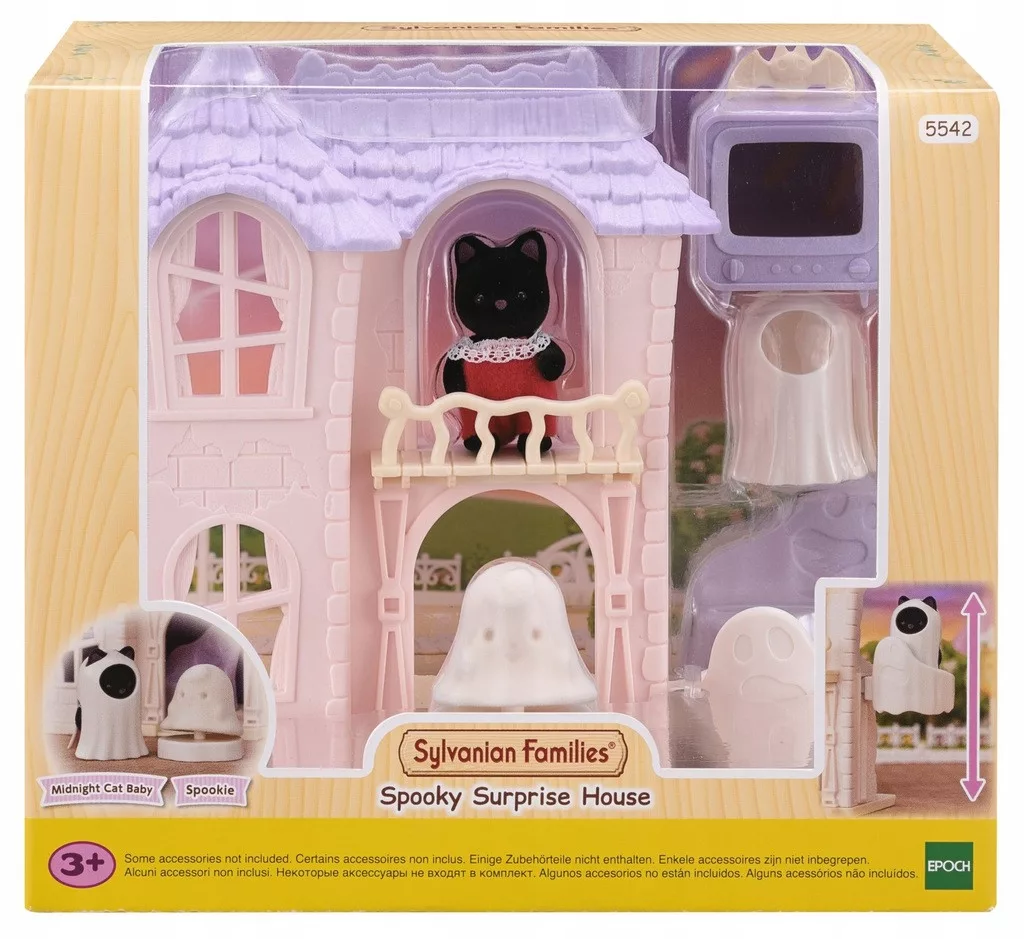 W parku rozrywki Sylvanian Park jest upiornie. W nawiedzonym domu Sylvanian Families naprawdę straszy. Dziecko czarnych kotków przebrało się za ducha i straszy inne dzieci. Z boku domu znajduje się winda, którą można ręcznie wciągnąć na pierwsze piętro. W nawiedzonym domu na gości czeka kiwający się duch, który potrafi się ukryć w telewizorze. Mały nietoperz na dachu chętnie siada na telewizorze i obserwuje świetną zabawę małych zwierzątek. Zestaw „Nawiedzony dom” zawiera nawiedzony dom z windą, fotel w kształcie ducha, telewizor, kiwającego się ducha i dziecko czarnych kotków wraz z kostiumem ducha. Produkt przeznaczony dla dzieci od 3 roku życia.