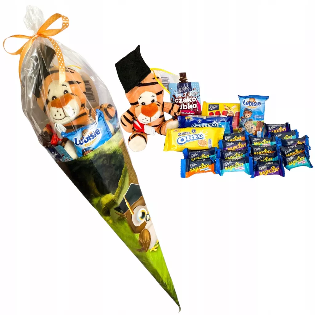 Idealny zestaw dla najmłodszych, aby umilić im koniec szkoły, ślicznego pluszowego tygryska z czapką uczniowską na głowie, otoczonego bajecznymi smakołykami w postaci czekoladek, kremu, ciasteczek, batonów i wafelków. Zestaw na pewno sprawi radość, podkreśli wyjątkowość momentu otrzymania świadectwa na Zakończenie Roku Szkolnego.