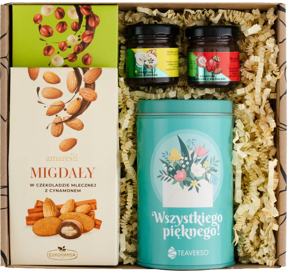 Uniwersalny zestaw prezentowy z herbatą w puszce, bakaliami i konfiturami