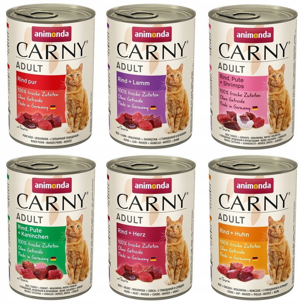 Animonda Carny Adult to zdrowa, pyszna, zbilansowana karma najwyższej jakościdla dorosłych kotów w wieku 1–6 lat.Koty są z natury mięsożercami, dlategoteż nie jest dla nich odpowiednia dieta składająca się wyłącznie z substancjiroślinnych. Dieta oparta na składnikach roślinnych nie zapewni kotom wszystkichniezbędnych składników odżywczych.Zboża powodują często nietolerancjepokarmowe, a ponadto mogą okazać się ciężkostrawne. W karmie Animonda CarnyAdult całkowicie zrezygnowano z dodatku zbóż. Ta karma mokra przygotowywana jest wyłącznie ze świeżych, mięsnych składników, tj. serca, płuca, mięso, wątroba, ryby oraz owoce morza.Przetworzone źródła białka zwierzęcego dostarczają również wartościowej tauryny, która jest niezbędna dla kotów. Koty nie są w stanie same wyprodukować tauryny w wystarczającej ilości, ważne jest więc, aby przyjmowały ją w pożywieniu. Tauryna może wspomagać funkcje serca, wzrok, odporność oraz funkcje skóry.