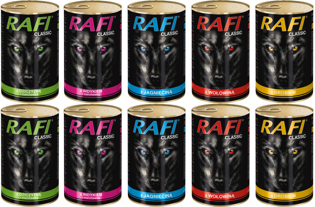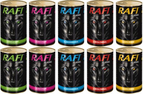 Linia Rafi Classic to pełnoporcjowe karmy dla dorosłych psów wszystkich ras. Odpowiednio skomponowany skład spełnia specyficzne wymagania żywieniowe psów dorosłych. Produkty te zawierają optymalną ilość tłuszczu oraz kwasów tłuszczowych (m.in. n-3, n-6) naturalnie występujących w mięsie i produktach pochodzenia zwierzęcego. Właściwy stosunek wapnia do fosforu w karmie przyczynia się do utrzymania prawidłowej homeostazy tych pierwiastków w organizmie psa i utrzymania mineralizacji kości na stałym poziomie.