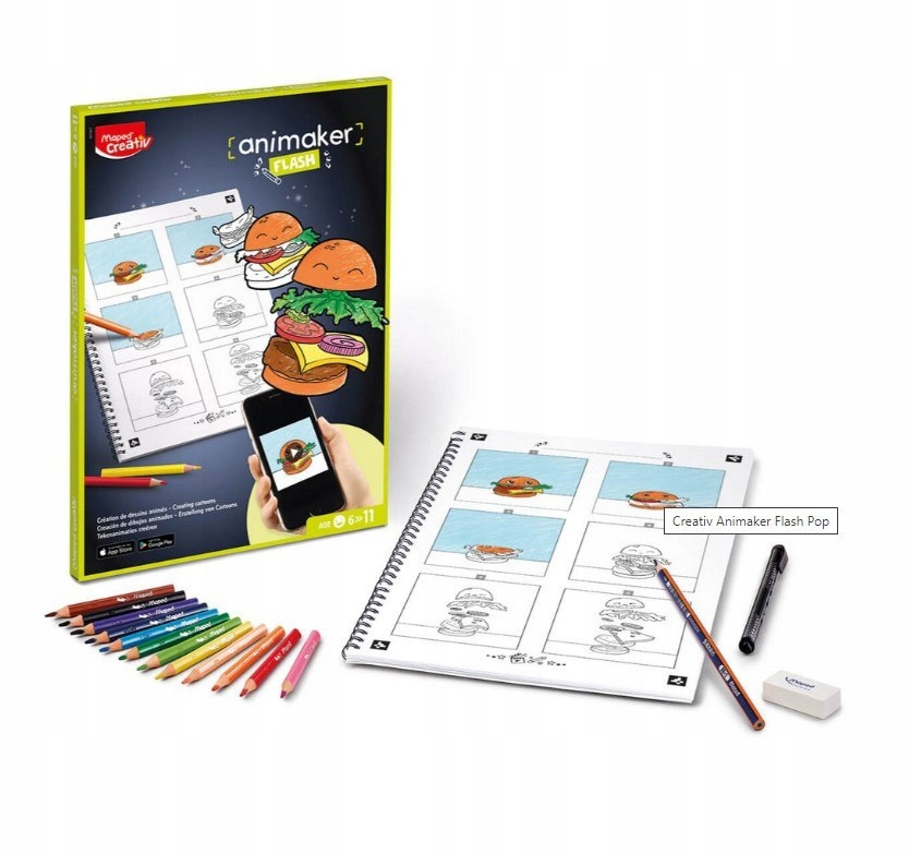 Maped Creativ proponuje zestaw Animaker Flash, który w połączeniu z darmową aplikacją, umożliwia nagranie 12 mini kreskówek na planie zaproponowanego szablonu lub według własnej, niczym nieograniczonej koncepcji.