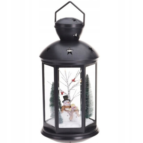 - wewnątrz latarni ośnieżona świąteczna sceneria z bałwankiem i drzewkami