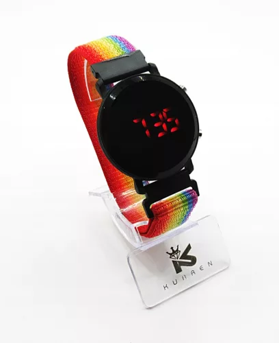 Nowy zegarek LED elektroniczny na materiałowym tęczowym pasku z czerwonymi cyframi na czarnej tarczy. Zegarek wykonany jest ze stali chirurgicznej 316L. Dzięki materiałowemu paskowi idealnie dopasuje się do każdej ręki.