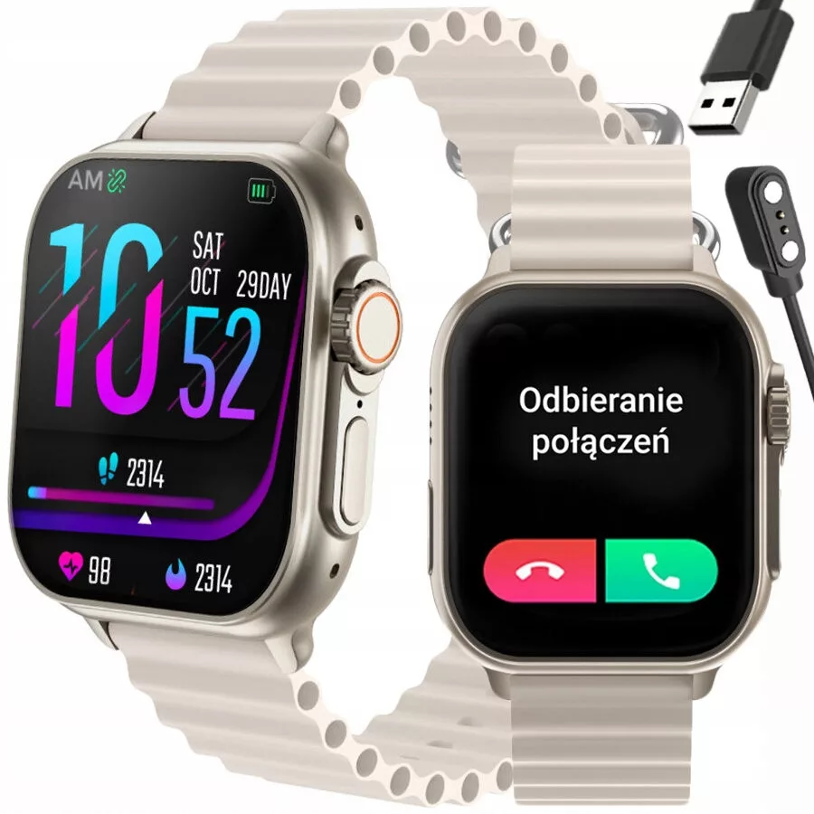 • Funkcje: Datownik, Budzik, Stoper, Powiadomienia SMS, WhatsApp, FB etc., Monitor snu, Sterowanie muzyką, Sterowanie aparatem, Monitor cyklu miesiączkowego, Tryby sportowe, Rejestr dystansu / spalonych kalorii, Znajdź telefon, Przypomnienie o wypiciu wody, Przypomnienie o ruchu, Powiadomienia o połączeniach, Menu w języku polskim, Motywy tarczy do wyboru, Pogoda, Latarka, Wykonywanie połączeń, Historia połączeń, Kalkulator