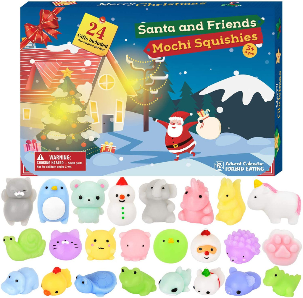 Produkty obejmują: 24-dniowy kalendarz odliczający zabawki dekompresyjne mochi (uwaga: wzory mochi są wysyłane losowo)