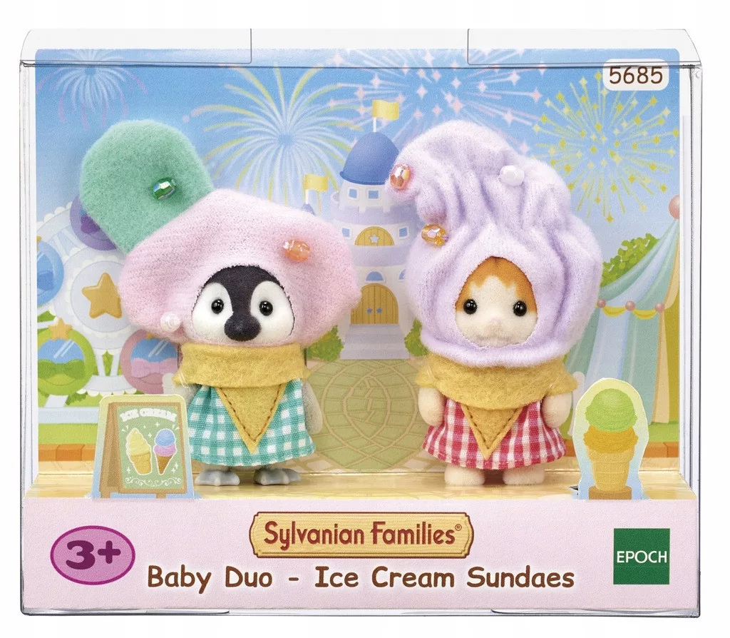 Lodowe dzieci Sylvanian Families kochają lody i przebieranki. Dziecko pręgowanych kotków ma na sobie kostium loda w wafelku, a mały pingwinek przebrał się za lód na patyku.