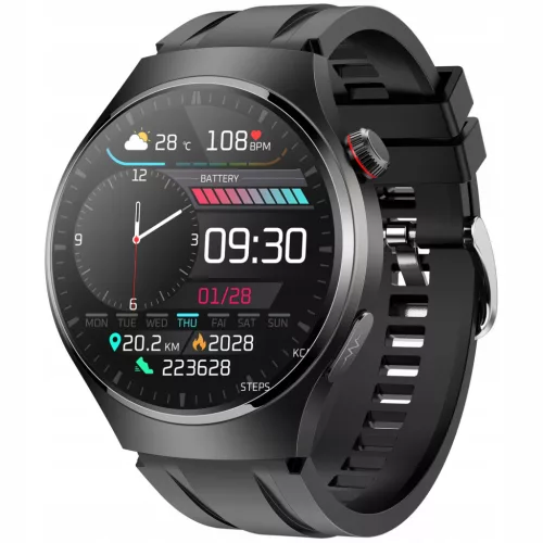 • Funkcje: Krokomierz, Alarm wibracyjny, Wbudowany mikrofon, Wybudzenie ekranu ruchem ręki, Odtwarzacz muzyczny, Pomiar glukozy, Licznik kalorii, EKG - Elektrokardiogram, Blokada ekranu hasłem, Alarm daty, Odrzucanie połączeń, Alarm hydracyjny, Ciśnieniomierz, Powiadomienia z telefonu, Asystent głosowy, Oprogramowanie treningowe, Funkcja znajdź telefon, Wykonywanie połączeń, Pulsoksymetr, Blokada przycisków, Pulsometr - pomiar tętna, Funkcja oszczędzania energii, Powiadomienia z aplikacji, Zdalne resetowanie zegarka, Czas dobowy 12/24h, Cykl miesiączkowy, Powiadomienia o wiadomościach SMS, Termometr temperatury ciała, Funkcja znajdź zegarek, Always on display, GPS, Monitor snu, Powiadomienia o połączeniach, Monitor braku aktywności, Kontakty telefoniczne - Zegarek pomaga w mierzeniu codziennej aktywności dzięki funkcji liczenia kroków.
