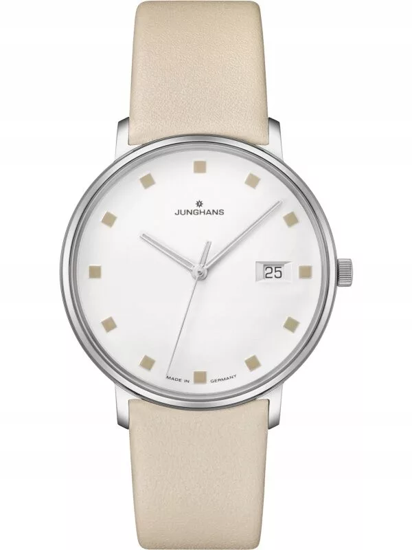 • Biała tarcza ma kształt misy z beżowymi znacznikami godzin. Napis Junghans o godzinie 12.
