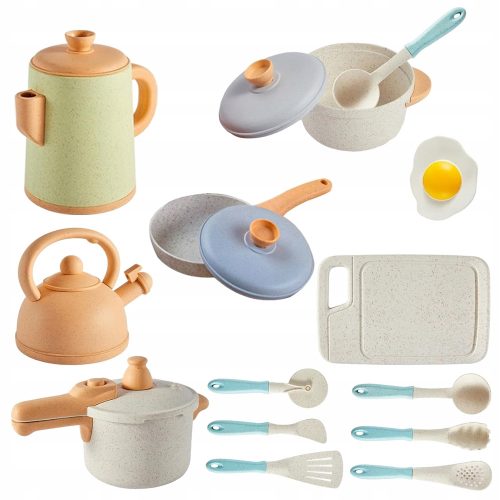 • Akcesoria kuchenne dla dzieci obejmują zestawy garnków i patelni, czajniki, czajniki, przybory kuchenne, deski do krojenia i zestawy do omletów.